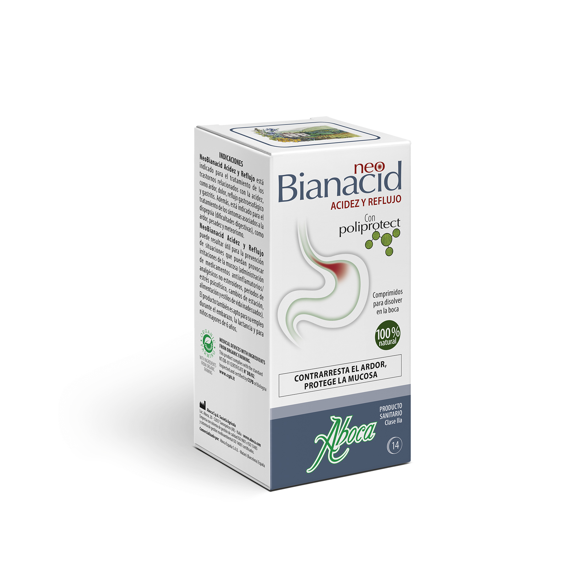 NeoBianacid Acidez y Reflujo es un producto sanitario a base de complejos moleculares vegetales y minerales que ejerce una acción protectora y lenitiva de la mucosa gastroesofágica útil para contrarrestar rápidamente el ardor, el dolor y la sensación de acidez.