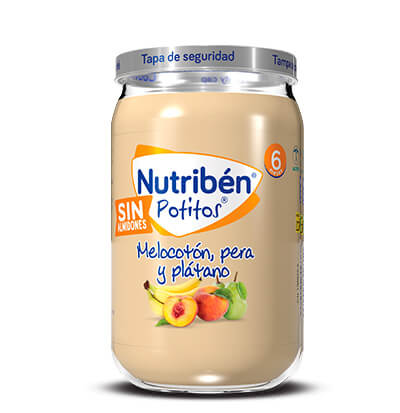 ¡Potitos® marca registrada de Nutribén®! Estos Potitos® 6 meses de frutas están elaborados a base de melocotón, pera y plátano para alimentar a tu bebé dentro de una dieta variada.