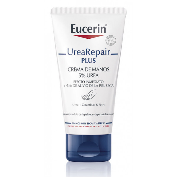 Crema especialmente indicada para el cuidado de la piel seca, extremadamente seca y áspera de las manos. También adecuada como coadyuvante del tratamiento médico, así como en casos de dermatitis atópica. Las manos están expuestas al frío, el agua, los jabones y otros productos químicos con mucha mayor frecuencia que el resto del cuerpo. Por eso son mucho más vulnerables a que se interrumpa la función de barrera cutánea, con el resultado de una pérdida de la hidratación y la penetración de irritantes, que pueden causar sequedad, enrojecimiento, descamación, picores e irritación. Eucerin® Repair Crema de Manos 5% Urea está enriquecida con urea y con lactato para calmar con rapidez incluso la piel de las manos irritada y seca de manera severa, o con eccema, al proporcionar la hidratación duradera e intensiva que necesita.