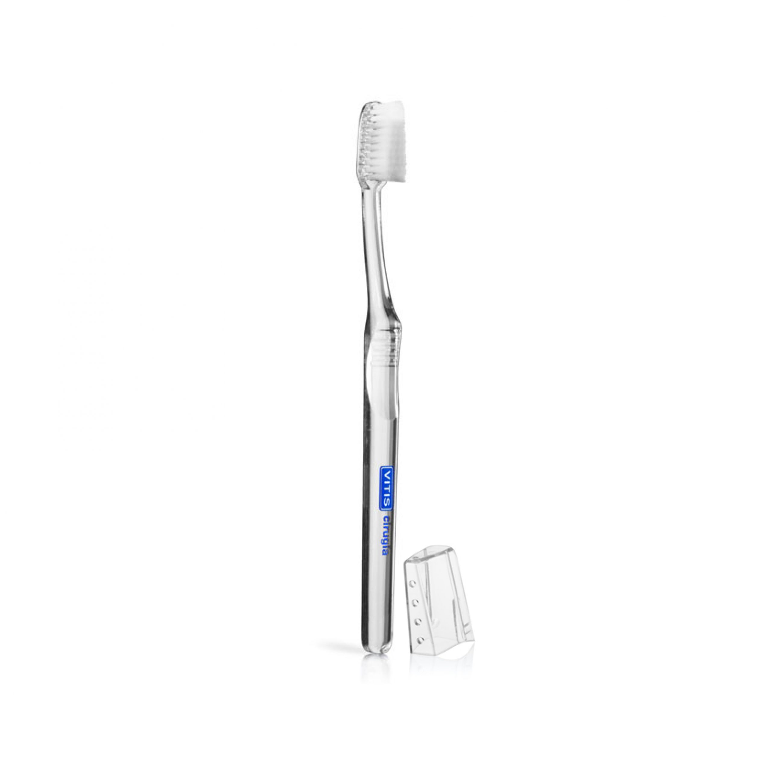 Cepillo de uso específico. Cabezal normal. Filamentos extra suavidad perfil recto. Cuello maleable que permite su flexión hasta adquirir la posición del cepillo que mejor se adapta a la cavidad bucal, facilitando la accesibilidad durante el cepillado