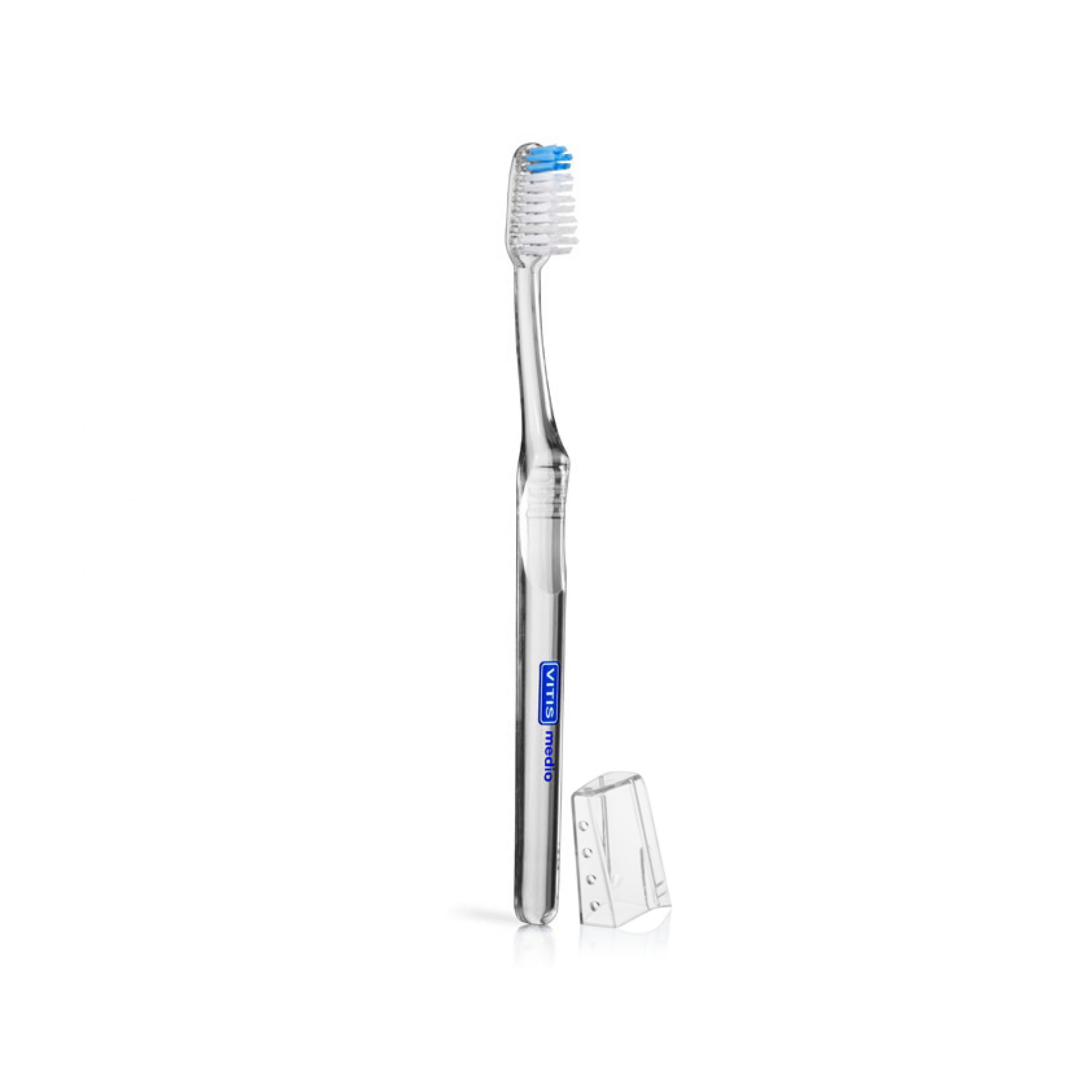 Cepillo de uso diario. Cabezal normal con forma diamantada para llegar a las zonas de difícil acceso de la cavidad bucal.